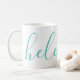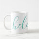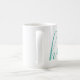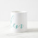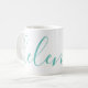 A gorgeous mug featuring a custom name in a modern, elegant script font. In green-blue aqua and white. Wonderful as a mother's day, holiday, birthday, housewarming or bridesmaid gift.