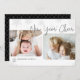 Simple et moderne Happy Nouvel An design de carte de vacances comprend deux de vos photos préférées avec un alignement décalé, encadré par des chutes de flocons de neige. "New Year Cheer" apparaît en écriture manuscrite décontractée classique, avec votre nom de famille et l'année dans le coin inférieur gauche. Un design contemporain unique dans un aménagement horizontal ou paysager pour un look de vacances tendance.