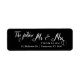 Une étiquette d'adresse de retour moderne simple et élégante en noir et blanc pour le futur M et Mme dans une belle typographie de script Élégantes étiquettes d'adresse de retour à utiliser pour les mariages, douches nuptiales ou tout autre envoi avant votre mariage. N'hésitez pas à customiser la couleur arrière - plan sous "customiser plus loin".