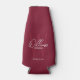 This design features personalized groomsman's name in white modern handwriting script font style and monogram in light burgundy red modern sans serif font style as background, with wedding details in white modern sans serif font style, on burgundy red background.