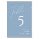 Voici notre magnifique script lunatique | numéro de table bleu poussiéreux parfait pour votre simple fête de printemps de boho moderne. Notre design élégant comprend une palette de couleurs vives et pastel avec un script de calligraphie vintage et chic. Que vous préfériez un style minimaliste ou classique, notre produit éditable unique offre luxe et élégance, parfait pour créer une touche élégante et romantique qui rendra votre journée spéciale inoubliable. Contactez-nous pour toute question sur le design, et laissez-nous vous aider à faire le mariage de vos rêves.