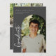Modern scripted "graduate", arch frame photo graduation announcement/invitation. Features, white typography on dark grey backgrounds.