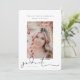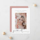 Signature script, photo snapshot, graduation announcement. Features, single vertical portrait photo on front and solid dusty rose colour backing.