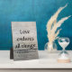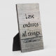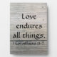 Beautiful message of faith and enduring love earns a place of pride on this weathered design. A wood surface that had seen its share of trials and tribulations, worn down by weather and time. Yet it is strong and endless. Faithful testament to the bonds of matrimony over many years. First Corinthians 13:7 bible scripture.