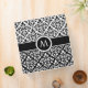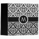 Scroll and leaf damask in a vintage style two-part pattern, with white detail on a black background at the bottom and black detail on a white background at the top with centre band and encircled letter/initial (on front and back) to alter to your own to make for a personalized folder.