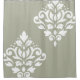 Scroll and leaf damask repeat design in white detail on a sage green background.