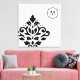 Scroll and leaf damask off-set (bottom left) design in black detail on a white background in a modern style art print with circle top right with initial to personalize.