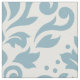 Scroll and leaf damask in a vintage style repeat surface pattern design, with light blue detail on a cream colour background.