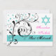 Elegant floral scroll leaf black, white, aqua flourish and Star of David Bat Mitzvah (בת מצוה) invitation, featuring white scroll leafs, swirls, curls and aqua dots on white background. There is a turquoise blue band with the text Bat Mitzvah to the bottom. Classy, modern, stylish and chic design perfect for your event. Name written in hot pink.