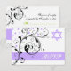 Elegant floral scroll leaf white, lavender purple flourish and Star of David Bat Mitzvah (בת מצוה) response/reply RSVP card, featuring black scroll leafs, swirls, curls and purple dots on white background. There is a purple band with the text RSVP to the bottom and lime green text on the back. Classy, modern, stylish and chic design perfect for your event. Change purple (background) to any colour!