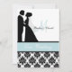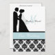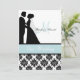 Black and white damask print with a sea blue band, a silhouette bride and groom, and areas you can personalize with your names, monogram initial, wedding ceremony and reception information on a customized wedding invitation that's classy and traditional all in one!