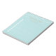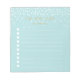 Chic personalized notepad features "to do list" at the top with your name beneath, in dark antique gold lettering on a pastel sea green background dotted with white confetti dots raining from the top. Keep track of all your important items with this lined to-do list note pad featuring 10 checkboxes.