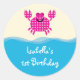 Very cute and colourful favour sticker ideal for a girl's birthday. Features a crab in vibrant colours and pattern. Great for sea, ocean or beach theme parties and events. Use it to seal envelopes or party favours.