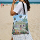 Take sunny style wherever you go with this vibrant beach house tote bag! Showcasing a sea foam green cottage, surfboards, and swaying palm trees, this coastal carryall brings laid-back beach vibes to your daily routine. Perfect for beach days, market runs, or as an everyday bag for ocean lovers who want to carry a bit of the coast with them.