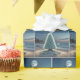 A sea glass Christmas tree stands on the beach under the bright full moon, with stars twinkling in the night sky as gentle waves crash against the shore