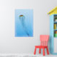 A watercolor painting of a jellyfish, with a colourful top, in the big, open, blue ocean.