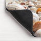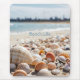 Let your mind drift as you think about the beach and collecting sea shells. Many sea shells in the sand along the shoreline. Crisp blue water and a row of tree's on other side of lake.