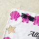Personalize black script name with pink sea shells and gold starfish on white background.