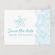 Simple outline drawing in white and blue of a starfish / seastar, with graphic wave swirls, save the wedding date card. Beautiful blue green and white wedding postcard to send out in advance of invites. A perfect invite for a beach, coastal ocean inspired, or ocean sea destination wedding Edit this invitation with your own words. Unique designed and drawn by Sarah Trett.