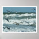Photograph of the North Sea surf with flying seagulls against blue sky.