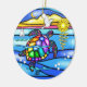 A brightly coloured sea turtle done in a stained glass style, swims toward the shining sun as a dove of peace flies overhead and a sail boat glides through the water in the distance.
