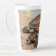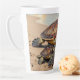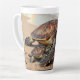 A coastal themed coffee mug with an illustration of a mama sea turtle and baby crawling into the blue ocean waves on a sandy beach.
