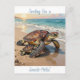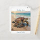 A coastal themed postcard to say hi and keep in touch with friends and family when travelling with an illustration of a mama sea turtle and baby crawling into the blue ocean waves on a sandy beach.