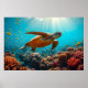 Colourful coral reef in sunlight, clear blue sea water, sea turtle and many small fish underwater.