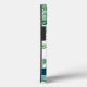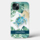 This custom phone case features a watercolor sea turtle, shoreline and tropical monstera palm leaves. Personalize with your name in white over a navy blue background. Artwork and design by Victoria Grigaliunas. To see more sea life and beachy phone cases like this visit www.zazzle.com/dotellabelle
