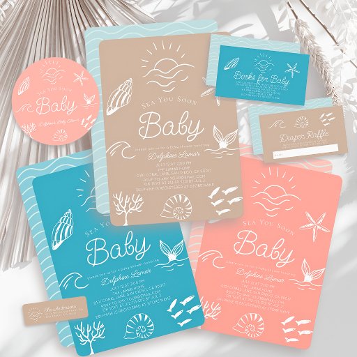 This cute 'Sea You Soon Baby' boy's baby shower diaper raffle ticket enclosure card features a blue background with hand-drawn sunshine over waves, a whale tail, a school of fish, seashells, coral, and starfish—all in white. Personalize it for your needs. You can find matching products at my store.