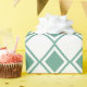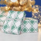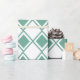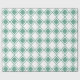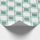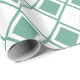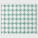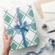 This wrapping paper has a mid-century modern design of solid seafoam diamonds inside seafoam diamond outlines on a field of white.