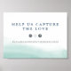 Designed to match our Seaglass Tides wedding collection, this elegant coastal style sign lets guests know about your custom wedding hashtag for social media sharing. Personalize the header and hashtag (shown with "Help Us Capture the Love") over a sheer wash of seaglass aqua watercolor that evokes the ebb and flow of the sea. Includes two social media icons joined by a heart.