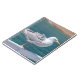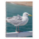 A close up photograph of a seagull on railings at the seaside printed on the cover of a notebook.
