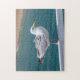 A close up photograph of a seagull perched on railings at the seaside printed on a puzzle.