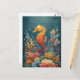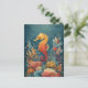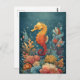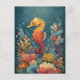 Detailed illustration of a seahorse surrounded by vibrant coral and marine plants, showcasing the beauty of underwater life with colourful, delicate elements in a serene aquatic setting.
