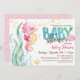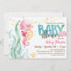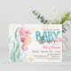 Belle invitation baby shower hippocampe. Il présente des couleurs rose hippocampe et bleu aqua, vertes et aquarelle.