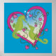 Pair of loving green seahorses are set in a pink heart with an ocean background. Accented by green foliage with smaller pink hearts.