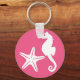 Mixed media digital rendition of a seahorse and starfish in white against a deep coral pink background
