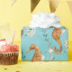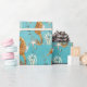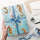 A nautical wrapping paper featuring watercolor painted seahorses with coral and seaweed against a Caribbean turquoise blue ombre background.
