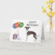Cute birthday theme design featuring Destei's original cartoon illustration of a cute seal and white colour Italian Greyhound / Iggy breed dog. Next to the dog there are colourful birthday balloons tied on a dog bone and a purple and yellow colour present box. The background has a playful pattern of colourful pastel confetti on a white background. There is also a personalizable text area that now reads: "Happy birthday!".