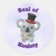 A sticker with the words" Seal of Koalaty with an illustration of a cute grey koala bear in a black top hat looking fancy.