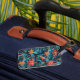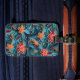 A beautiful luggage tag with a seamless paper floral pattern against a blue background.