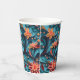 A beautiful set of paper cups with a seamless paper floral pattern against a blue background.