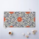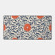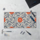 Seamless floral pattern with vibrant orange flowers and navy blue leaves on a beige background, creating an ornate, symmetrical design.