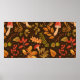Seamless pattern decorated with autumn leaves, forest mushrooms and tree branches. Repeatable seasonal background with chestnut, berries, acorn and foliage. Flat Vintage illustration of rowanberries