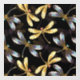 Seamless pattern with gold, jewellery, shiny dragonflies with detailed, sparkling wings on black background. Gold dragonfly.