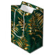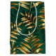 Seamless pattern of gold, jewelry, shiny fern branches and leaves on green, woodland, textured background. Golden fern.