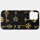 Seamless pattern of antique, gold and silhouette keys on black background.