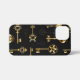 Seamless pattern of antique, gold and silhouette keys on black background.