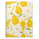 Seamless pear pattern. Different pears whole fruits and pieces with leaves on light yellow background